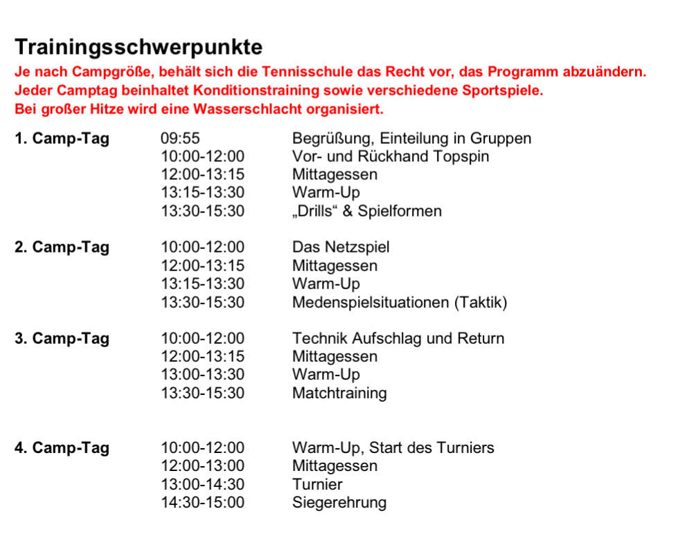 Das Trainingsprogramm war vielseitig und umfassend (siehe Foto Trainingsplan): zum Warm-Up gab´s das Lauf-ABC (Koordinations- und Konditionstraining), um die Beweglichkeit und Ausdauer zu verbessern. Technische Schlagübungen standen ebenfalls auf dem Programm: Vorhand, Rückhand, Aufschlag, Return und Topspin wurden intensiv trainiert. Verschiedene Spielformen und Matchtraining rundeten das Programm ab und sorgten für eine abwechslungsreiche und effektive Trainingswoche.