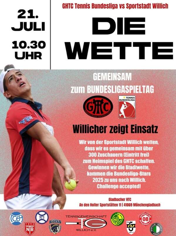Der Stadtsportverband Willich hat gewettet, 300 Personen aus dem sportlichen Umfeld der Stadt Willich zu aktivieren und zum Heimspiel des GHTC gegen den aktuellen Tabellenführer Bärchen Versmold zu bringen. Und wir sind dabei. Eintritt ist kostenlos. Wer also Zeit und Lust auf spannendes Bundesliga Tennis hat, der sollte am Sonntag zum GHTC kommen.