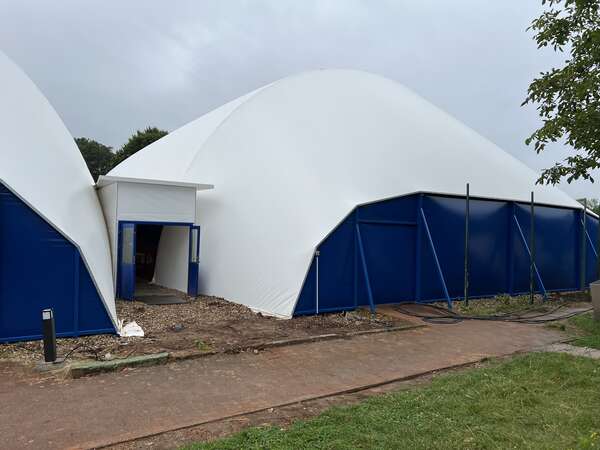 dann wird die Stahlstruktur lackiert und später die neue Membran wieder montiert.