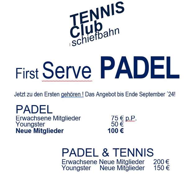 Daher die große Bitte, um auch die Nachfrage und Einnahmen bei dem getätigten Investment kalkulieren zu können, gebt uns bitte schnellstmöglich eine einfache Rückmeldung per Mail an app@tc-schiefbahn.de mit "Ich buche des "First Serve" Angebot für PADEL 2024 hinzu. Dann hinterlegen wir dieses Merkmal in Euren Daten und Ihr seid ab September damit vollumfänglich spielberechtigt. Für alle die, die noch überlegen und ausprobieren möchten, ist das Angebot bis Ende September buchbar und bis Ende August kostenfreies Spiel nach Verfügbarkeit der Plätze möglich. Danach nur über Gastbuchungen und dies bis zu 5x p.a.. Die Kosten liegen bei 10€ p.Person und Stunde.