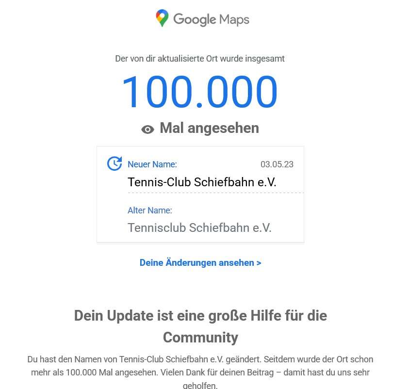 WOW - 100.000 GOOGLE VIEWS für den Tennis Club Schiefbahn ! Das ist doch schon nicht schlecht. Aber nur 53 Bewertungen bei GOOGLE. Daher noch einmal die Bitte an Alle Mitglieder und Freunde, wenn Ihr etwas Nettes über den Club zu sagen habt, dann macht dies bitte hier ! Ihr seht den Traffic. Jede gute Bewertung erhöht die Wahrscheinlichkeit auf neue Mitglieder. Dann bitte mit Euren GOOGLE Daten anmelden und den Tennis Club Schiefbahn bewerten. Für die 100. Bewertung spendieren wir einen Hoodie aus unserer TCS MERCH COLLECTION. Here we go ! Zusammen Gewinnen und gemeinsam wachsen !