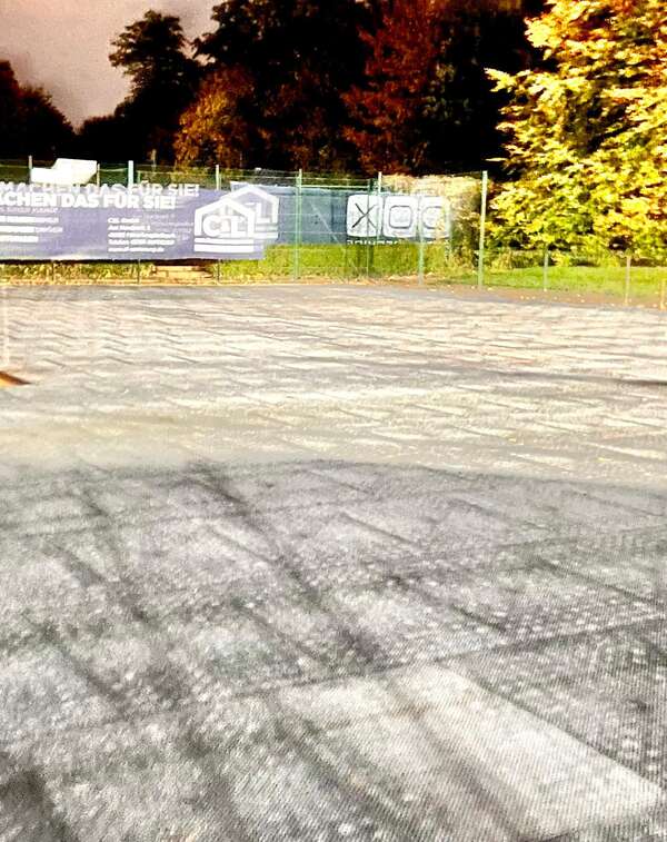 Die Arbeiten am neuen Hardcourt-Boden sind ebenfalls in vollem Gange. Nachdem die alte Asche abgetragen und der Platz sorgfältig verdichtet und geebnet wurde, haben wir in den letzten zwei Tagen den speziellen Sponcrete-Air Leichtbeton gegossen.