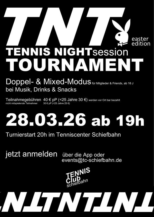 am Samstag, 28.03.2026 wird das Tenniscenter Schiefbahn wieder zur Bühne für das legendäre TNT Tennis Night Session Tournament.